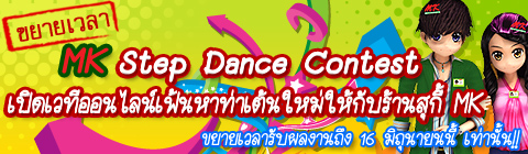 MK ร่วมกับ เกมออดิชั่น ขยายเวลาร่วมสนุก ในแคมเปญ "ความสนุกที่เพื่อนให้กันได้ กับกิจกรรม MK Step Dance Contest" ให้เพื่อนๆ ได้ร่วมโชว์ไอเดีย ในการออกแบบท่าเต้น สำหรับพนักงาน MK ทั่วประเทศ ชิงเงินรางวัล มูลค่า 30,000 บาท จากผลตอบรับในกิจกรรมที่มีผู้ให้ความสนใจต้องการร่วมสนุกเพิ่มเติม แต่ไม่สามารถส่งคลิปเข้ามาร่วมสนุกได้ทัน วันนี้ทีมงานจัดให้ตามคำเรียกร้องขยายเวลาการส่งผลงานเข้าร่วมสนุก ได้ตั้งแต่วันนี้ จนถึงวันที่ 16 มิถุนายน 2552 นี้เท่านั้น