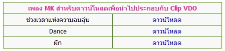 1. ดาวน์โหลดเพลง MK ที่ลิงก์ด้านล่างนี้ แล้วออกแบบท่าเต้นประกอบเพลง MK และสามารถดัดแปลงจังหวะดนตรีของเพลง MK ใหม่ได้ (เพลง MK มีให้ดาวน์โหลด 3 เวอร์ชั่น)